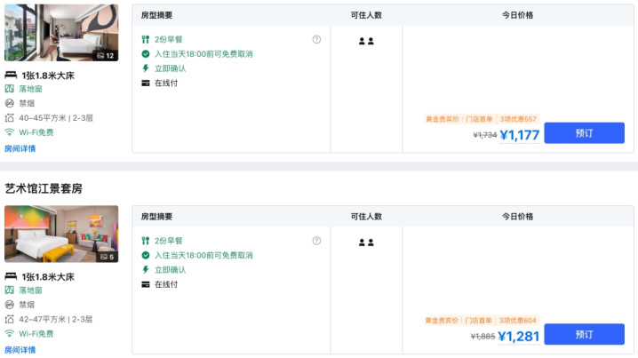 界面新闻注意到,相关逸扉酒店目前在携程平台上仍可正常预订。该酒店住宿价格在千元以上的主要有两种房型,一种是1177元(挂牌价1734元)一晚的艺术馆行政套房,另一种是1281元(挂牌价1885元)的艺术馆江景套房。